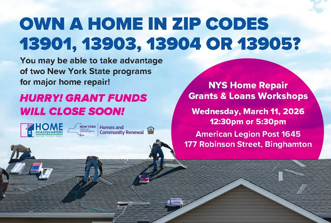 Join Home HeadQuarters and City of Binghamton Staff for an informational workshop on grants and loans available to homeowners in Binghamton. Two workshops will be held on Wednesday, March 11, 2026, at 12:30 PM and 5:30 PM at American Legion Post 1645, located at 177 Robinson St, Binghamton. Seating is limited; reserve your spot today by emailing info@homehq.org.